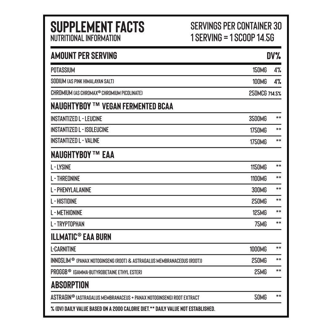 Illmatic® BURN is geformuleerd met 7 gram veganistische gefermenteerde BCAA's in een verhouding van 2:1:1, 10 gram EAA's en 250 mg elektrolyten.
