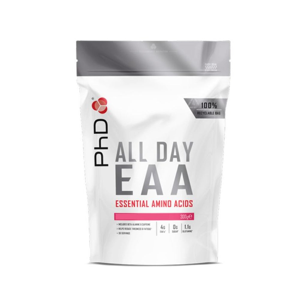 PhD All Day EAA is een verfrissende, heerlijke en makkelijk te mixen drank voor, tijdens en na de training, die essentiële aminozuren (incl. vertakte aminozuren) bevat, evenals L-Glutamine. Aangezien de essentiële aminozuren niet door het lichaam zelf kunnen worden aangemaakt, moeten ze als onderdeel van de voeding worden geconsumeerd.