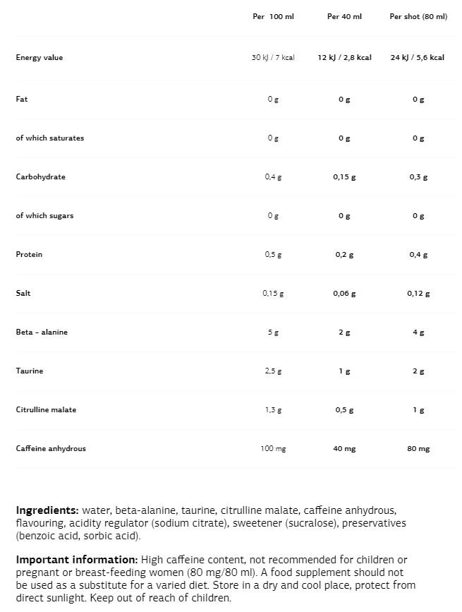 Pre-Workout Xtreme is easy-to-take shot that is perfect for pre-workout use. The shot contains popular pre-workout ingredients: Beta-alanine, Taurine, Citrulline malate and Caffeine.